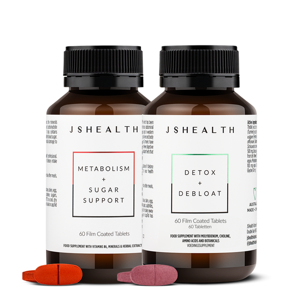 Contains 2 favourites, Metabolism + Sugar Support formula and Detox + Debloat formula.
