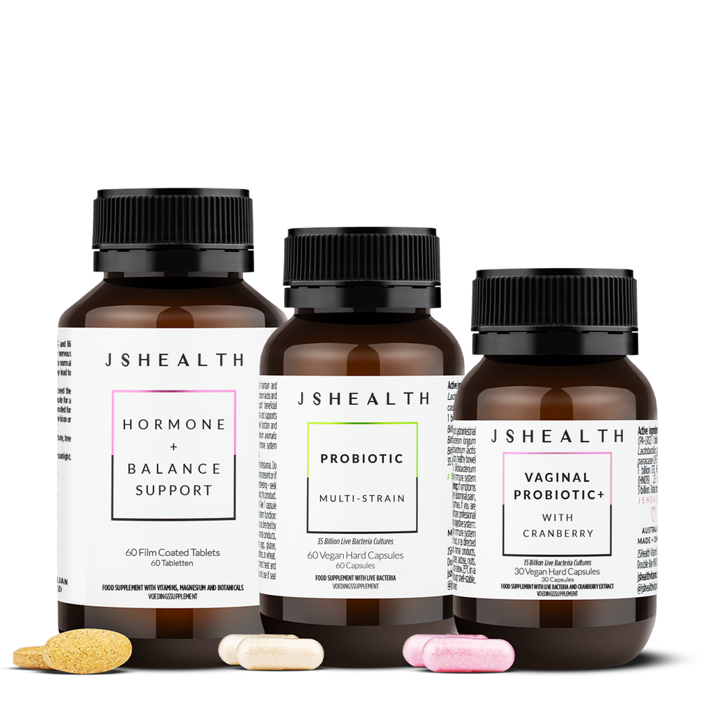 Designed to support your female needs, this kit features Hormone + PMS Support, Vaginal Probiotic+ and Hair + Libido.