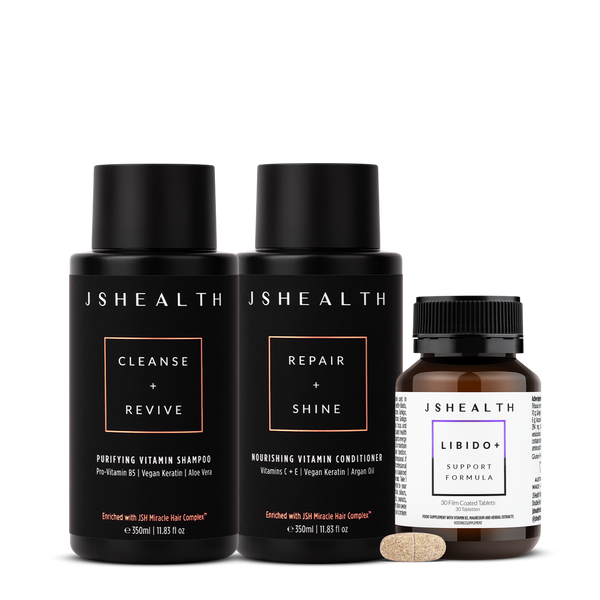 Give yourself inside-out support in the hair (and bedroom!) department with our Hair + Libido formula and natural, topical 2-Step Vitamin Haircare System.